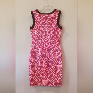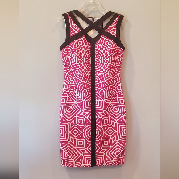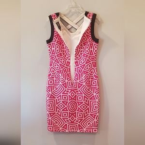 Flattering dress with a nice design pattern on it. Pink and white design with black detailing and a criss cross in the front.