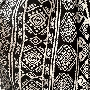 Never worn. Not as big and flowy as harem pants. But still very flowy. The crotch is just at the normal crotch level. Very nice elastic. Good material.
