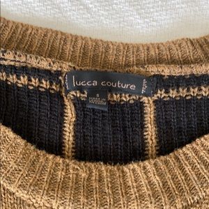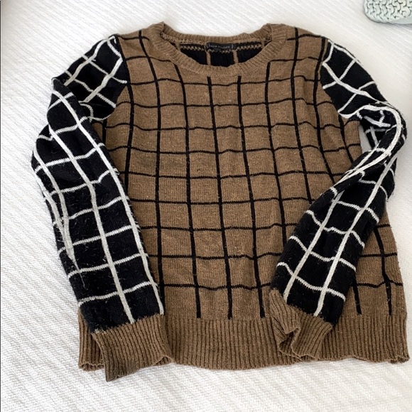 Contrast sweater with black and white sleeves and tan and black top.