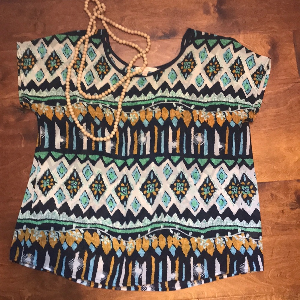 21 inches pit to pit. About 25 inches long from the top of the shoulder. Semi sheer. In good used condition. This is an oversized Small. Anthropologie look.
