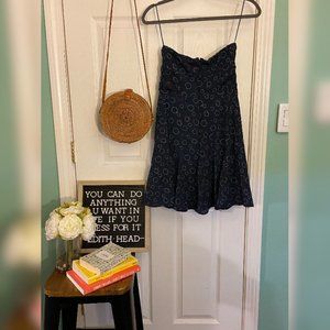 American Eagle Mini Dress, sweetheart neckline, boning for structure, and a-line skirt with good movement. Navy with pink and beige circle polka dot pattern. Invisible back zipper. Very flattering cut and great for summer events!
