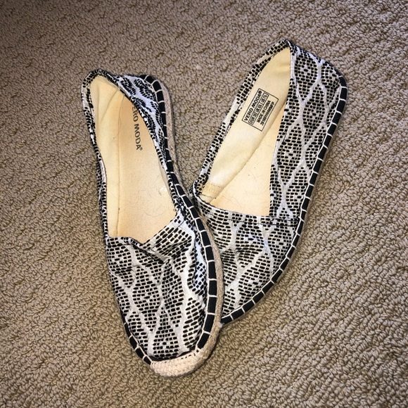 Has espadrille sole and cute pattern! Easy to slide on. Size 7 1/2 but could stretch for 8 because of fabric.