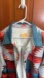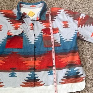 Stylish Aztec-patterned jacket in red, blue, and white. Soft, woven fabric with button-front closure and chest pockets. Casual layering piece that adds bold color and texture to outfits. Comfortable fit designed for everyday wear.