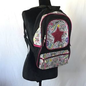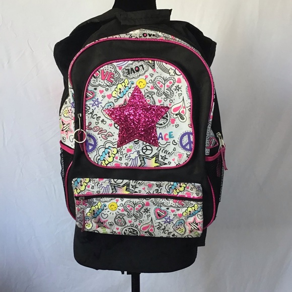 Mostly black background with pink glittery star on center. Has a background with words, stars, and peace signs. Small tear on right side of backpack. Used, but in good condition.