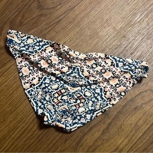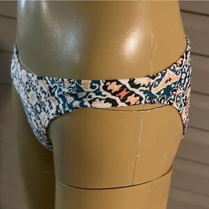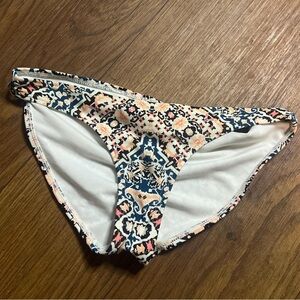 Peachy pink,blue,black & white abstract print low rise bikini bottom with rouched backside.Excellent condition.
