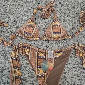 Boho bikini set from Beach Bunnies boutique. Features a mix of brown, navy and orange tones. Top and bottoms are adjustable! Size large fits like a medium. Bottoms are cheeky coverage.