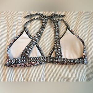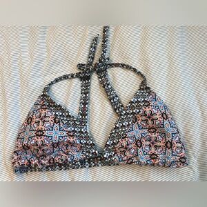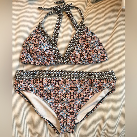 Stylish bikini set with intricate geometric patterns. Features a halter neck top and matching bottoms. Perfect for the beach.