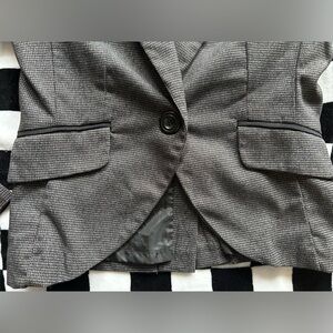 Fitted black and grey patterned blazer, size small. Gently loved and from a smoke-free, cat-friendly home. Gently washed prior to shipping.