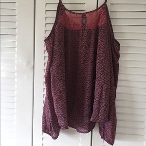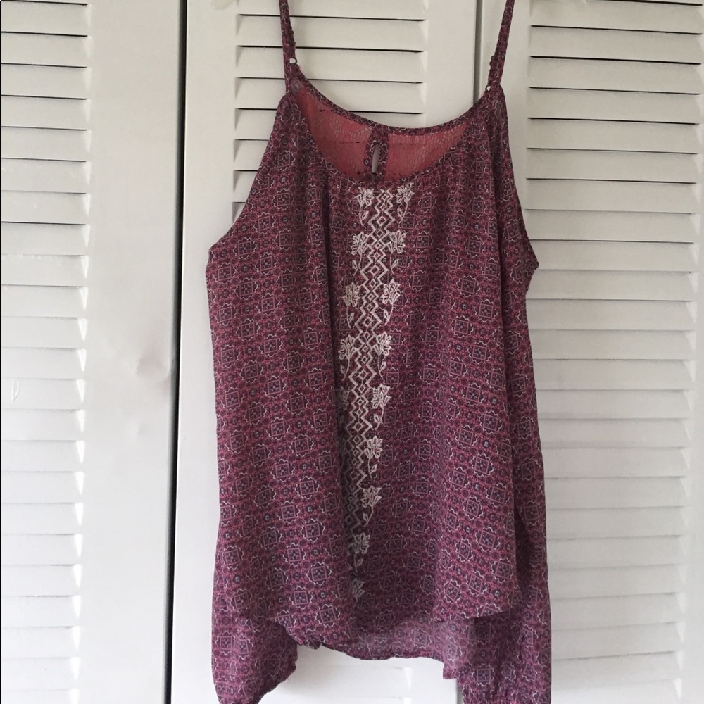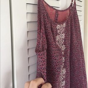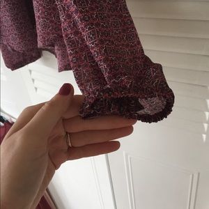Pink and purple pattern - at each end of the sleeves there is a tighter material to hold on to your arm better - looser fit - pattern and tiny slit on the back of the shirt towards the neck - also on the front of the shirt in the middle there is a gorgeous white pattern