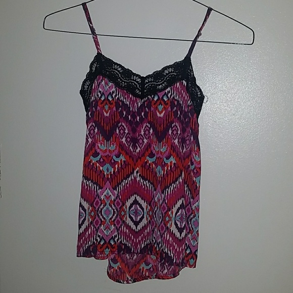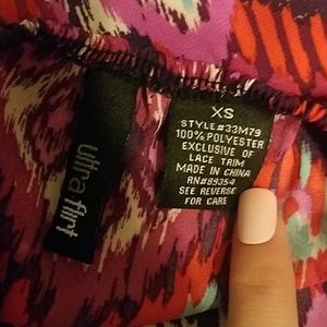 Ultra Flirt-Macy's brand Various colored patterned blouse Very slowly and soft Black lace trim around neck Straps attached Size XS