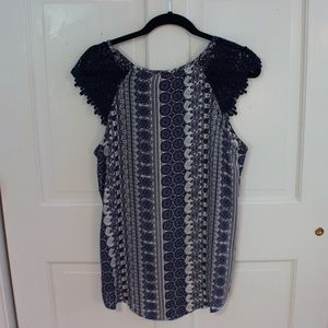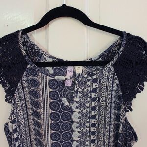 This adorable top is in great condition! The cap sleeves are made of sheer crochet lace and the front features a keyhole. The back is slightly longer than the front.