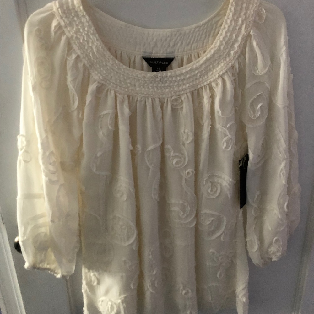 White 3/4 sleeve off-white blouse with swirl pattern. Flowy and cute to match with anything, making it formal-appropriate and casual. Don't worry about it being see-through as there is a lining underneath the sheer top layer. Still has tags and has never been worn.