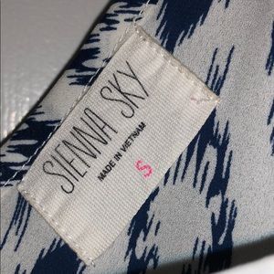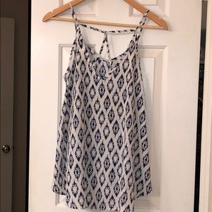 Size Small, off white and navy blue pattern, thin straps with style in back, high-low shape, very flowy, polyester material