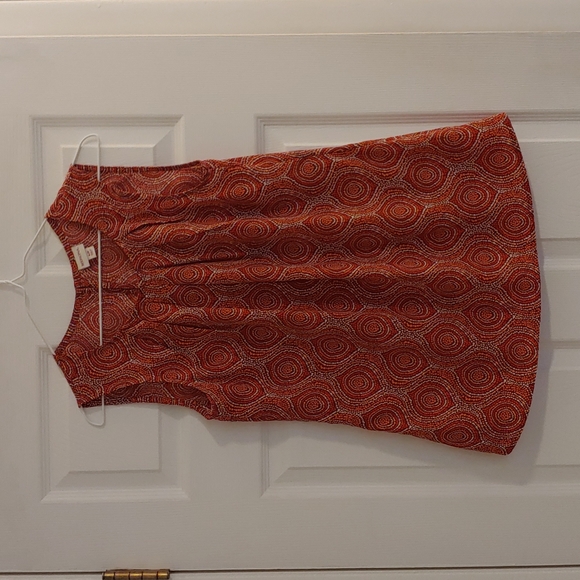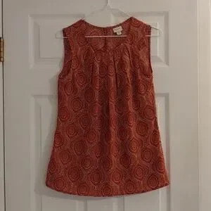 Multicolored sleeveless blouse with coral, red, and white pattern. Gathering around neckline and button closure in the back. EUC.