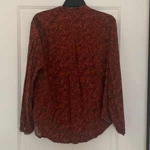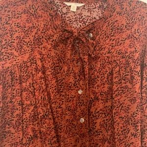 Only worn once! Cute rust red/orange blouse with tie. It has a red and black spotted pattern on it. It buttons all the way down. Cute little slits in the sleeve cuffs. From a pet and smoke free home.