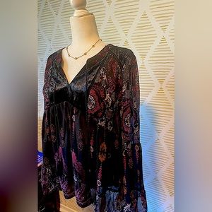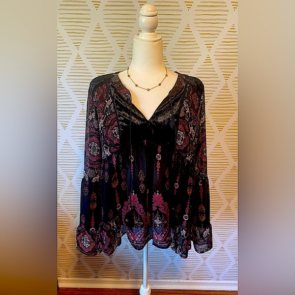 A super pretty and flow-y blouse in great condition. Velvet details over the chest. Sheer fabric but not completely see through.