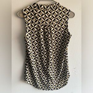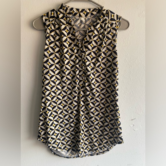 This blouse is a size small. The colors in the pattern include yellow, navy blue and white.