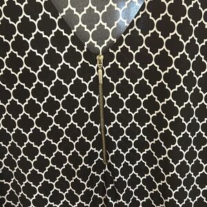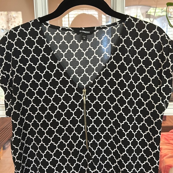 Beautiful patterned blouse from Express that is perfect for work or a night out! It is very light and silky which makes it very versatile. The zipper does work and is not just for looks