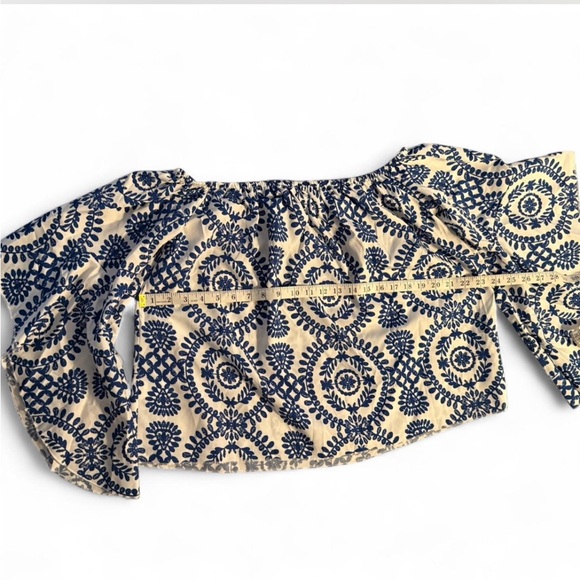 Like new. Women's White and Blue Off-Shoulder Blouse - Features wide, long sleeves. Labeled size Small, but fits more like a Large.