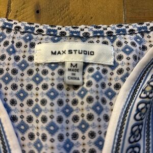 3/4 Length Blue and White Patterned Blouse that ties in the front, size medium