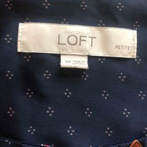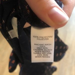 Blue blouse with an orange pattern, silky material. It is a sleeveless with a ruffle detail. Very cute! It can be dressed up or down, great for work. Only worn a handful of times. Machine washable.