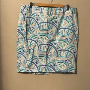 This stylish women's skirt features a vibrant blue and green pattern, perfect for adding a pop of color to your wardrobe. Ideal for casual outings or a day at the office.