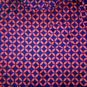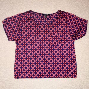 Orange and blue patterned box-cut shirt. Fits nice on shoulders with plain crew cut neckline, super appropriate for office workplaces or nicer restaurants! Also has front pocket with matching pattern.