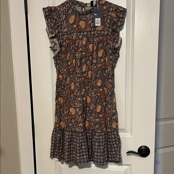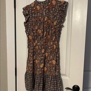 Stylish dress with ruffle sleeves and a vibrant pattern. Perfect for any occasion.