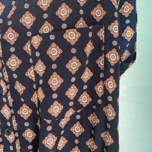 super cute romper!! it’s perfect for really any season! i sometimes wore it with tights and boots and it was adorable! it has buttons all the way in the front along with a cute pocket. it works well with a belt to break up the pattern or without one! says medium but would fit a small also