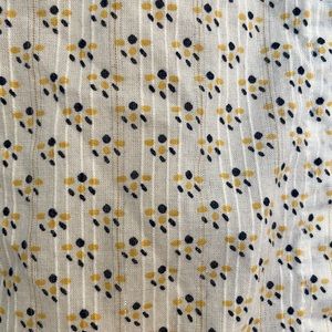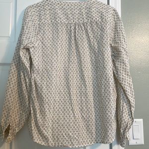White blouse with yellow and blue pattern throughout. Button down in the front and buttons on the sleeves at the wrists.