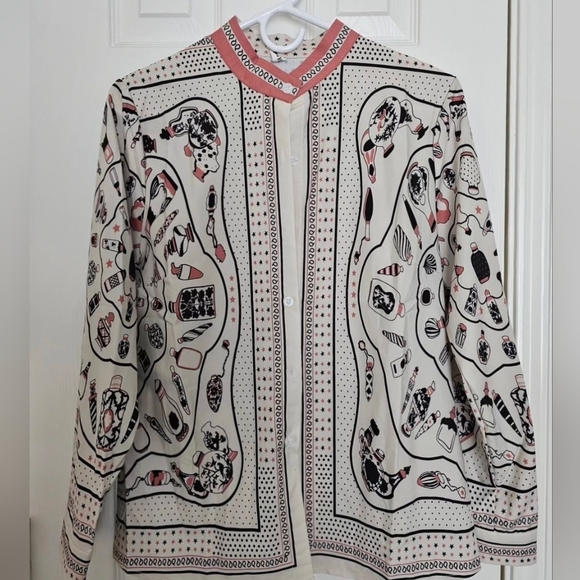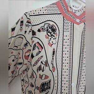 Stylish blouse with intricate patterns. Features a button-up front and long sleeves. Predominantly white with black and pink accents.