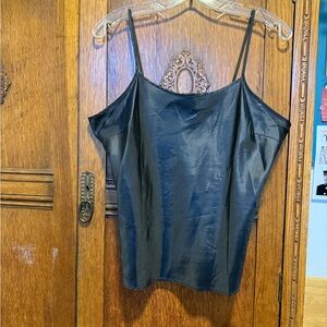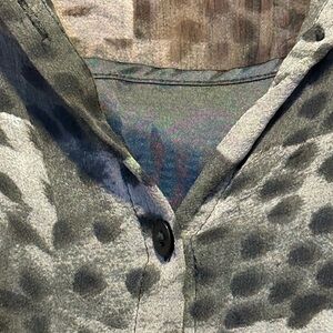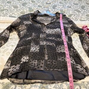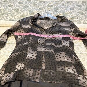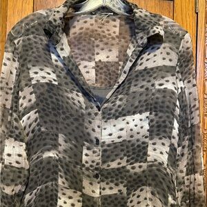 Stylish patterned button-up blouse with a mix of gray and black tones. Has a separate black satiny tank underneath. Sheer blouse on top. Polyester rayon blend. Removed the tag because you could see it through the shirt and I don’t remember the brand. I’m sorry. Perfect for casual or formal wear.