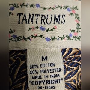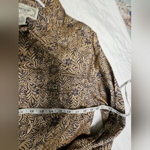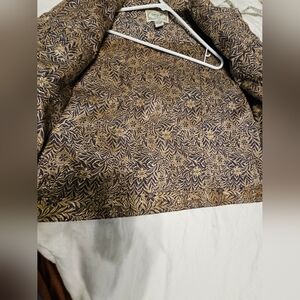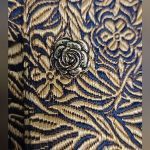 Stylish patterned button-up jacket. Features a unique design with a mix of blue lines and florals ina shimmering metallic gold color. rose shaped metal buttons. in excellent condition.
