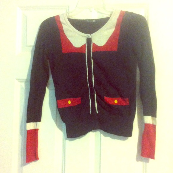 Patterned navy cardigan with snap buttons. Fits a size xsmall or a size small.