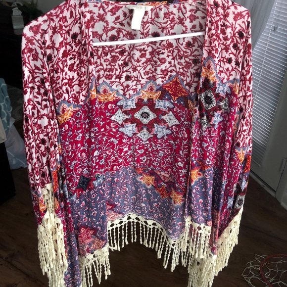 Barely worn cardigan! It has super cute tassels on the bottom and it is perfect for festival! It says M/L but could definitely fit a small!