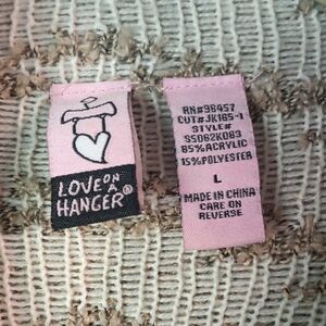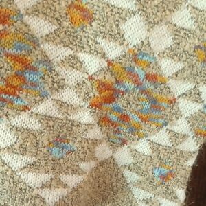 Warm cardigan with a geometric pattern. Features a mix of tan, cream, and orange colors.