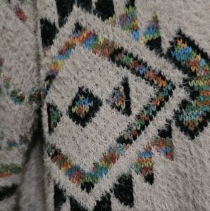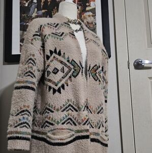 Chic and warm long cardigan with geometric patterns. Ideal for layering. By my Michelle, xl.