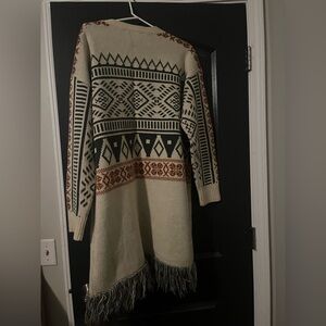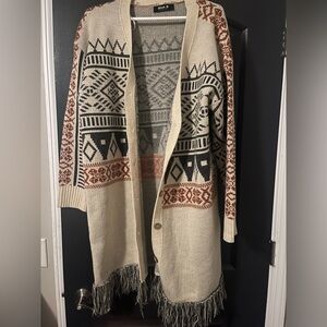 Cozy cardigan with patterns. Features cream, black, and rust colors. Perfect for layering. Super comfy. Size large but fits XL fine and probably XXL as well.