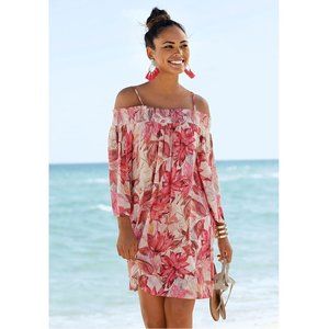 Pretty Summer dress featuring a wide Carmen style neckline with adjustable spaghetti straps and smocked insert.
