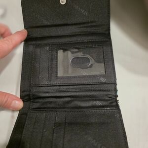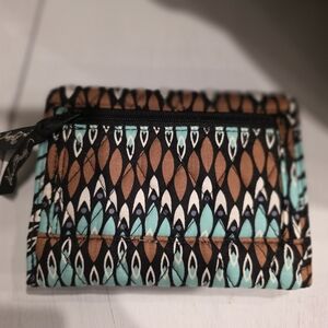 Stylish Vera Bradley clutch with a geometric pattern. Features brown, black, and teal colors.