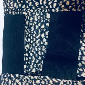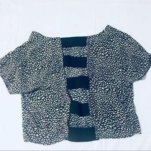 Cropped shirt with a beige and navy pattern. Kind of looks like abstract animal print. Light soft material and black elastic bands in the back to show off a cute bralette. Fits size medium. Good used condition.