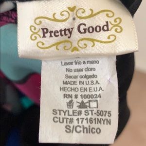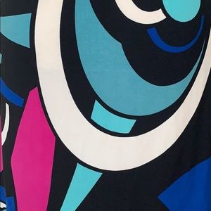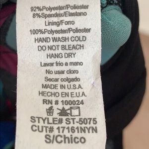 Patterned Cross Back Dress with Royal Blue, Magenta, Cream, Cyan, Light Blue, and Black Coloring. Stretchy material. Removal padding in the breast area similar to what comes in bathing suits.