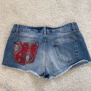Denim short with pattern overlay. Zip and button enclosure. Fits like US size 00