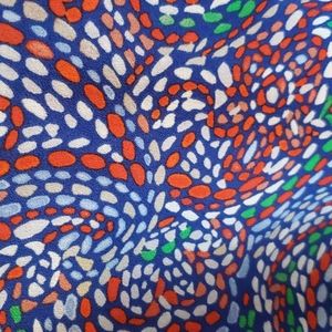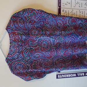 One of my favorite tops from when I was teaching. Such a fun print to layer under just about anything! Modest neckline. Flattering cut with a top layer that creates some interest in the front. Very lightweight material. Short sleeve.
