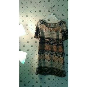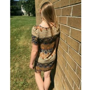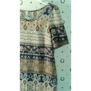 This dress is short-sleeved, non-stretch, multi-patterned, and has a small bust area. Height: 2 ft 6.5 in, Width: 25 in