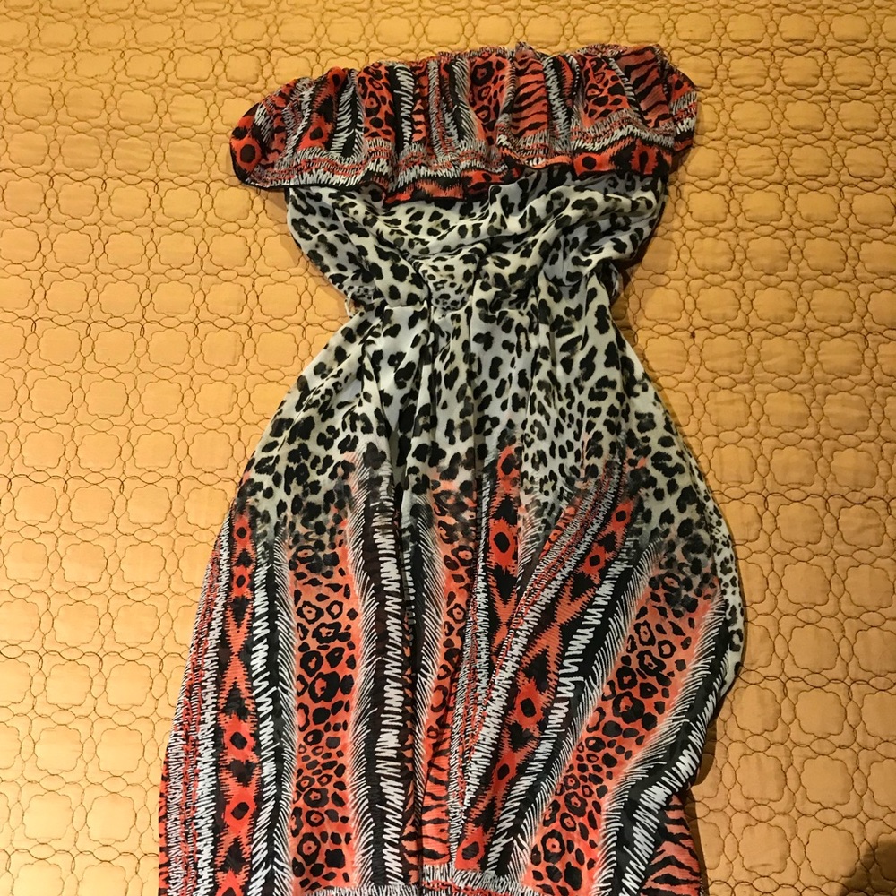 This dress is strapless and short in the front and long in the back. Very nice material. Great with heels or sandals.