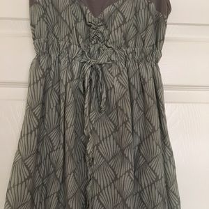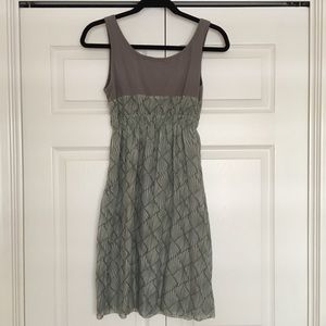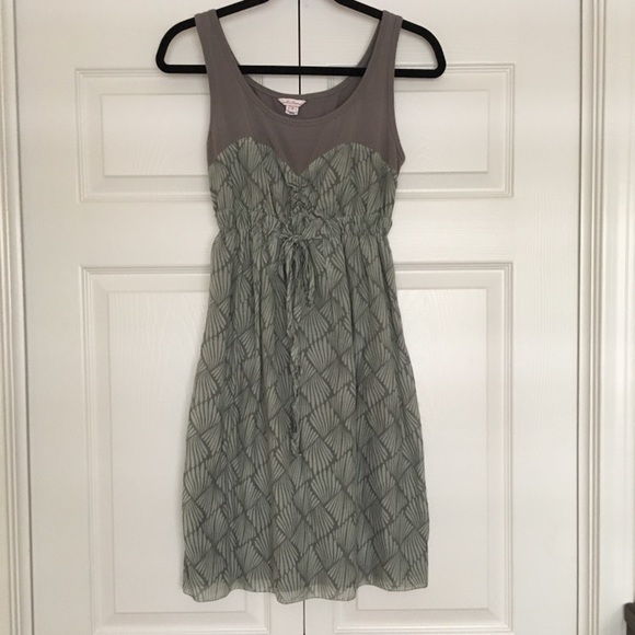 Pattern midi length sleeveless dress. Light green and greenish gray. Size small. Elastic waist with a rope to tie for a more form fit. Worn once and in excellent condition
