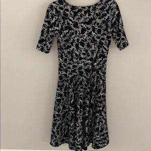 LulaRoe dress. Pattern is a bird, stretchy material, sleeves go down to elbows, top is tight but the bottom flares out and hits right under the knee. Stretchy material so could fit also fit a size large (what I typically wear)!