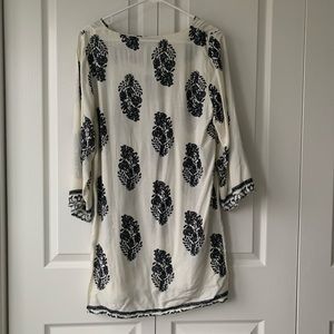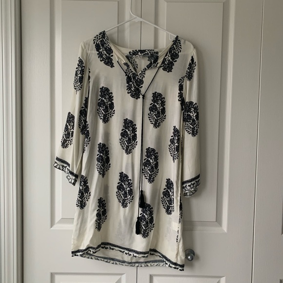 Cute patterned dress. Has tassel ties from the collar. Great for vacations or the beach as a dress or swim coverup! Unlined. Never worn!