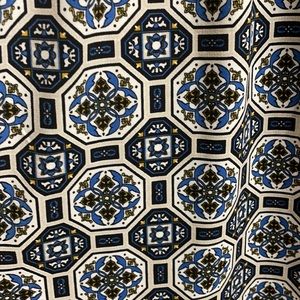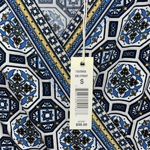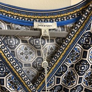 This pattern is absolutely BEAUTIFUL and so unique! Blue, gold, and soft white. Short v-neck. Adjustable tie on the side. BRAND NEW!